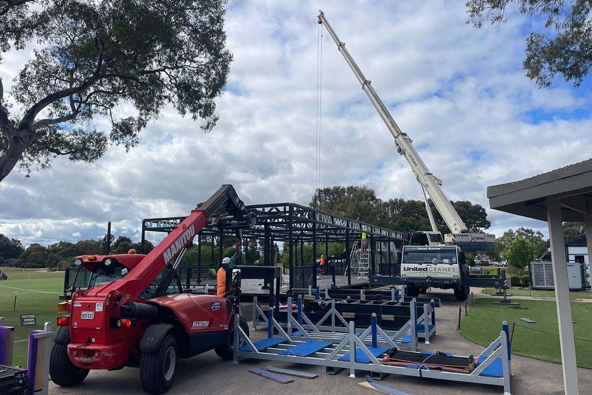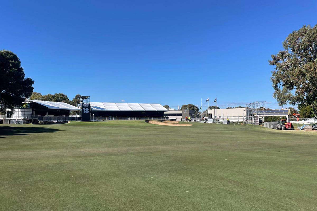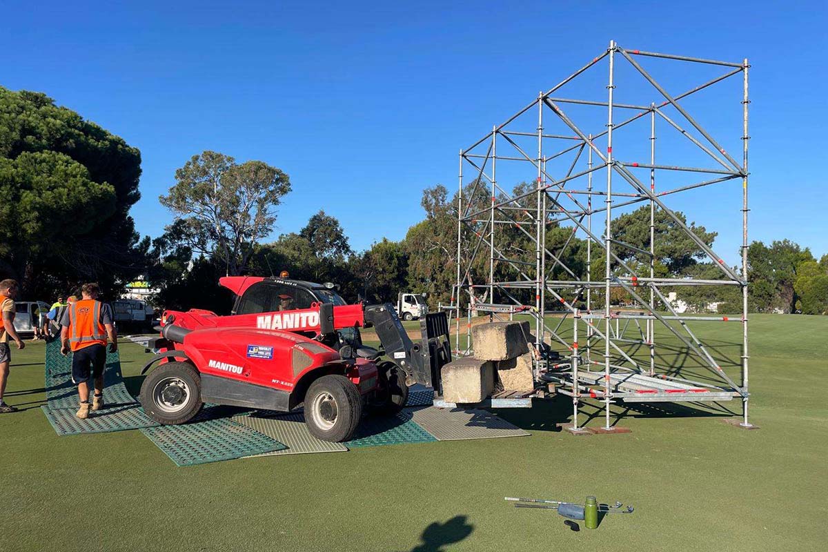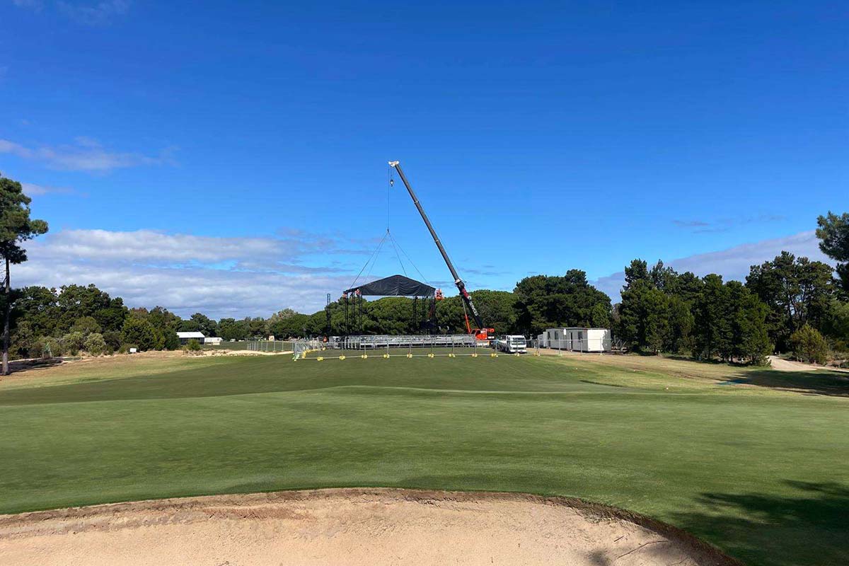 - Concert stage construction works underway in Fan Village on 1st West fairway